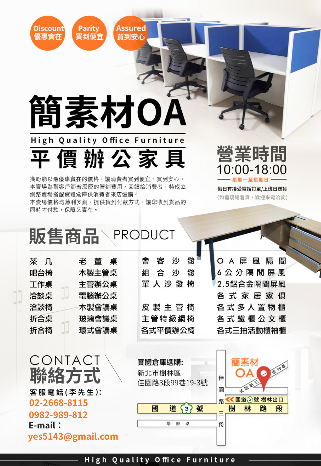 ▶我們位於新北市樹林區,交通便利,無論您是新創業者或是已開公司一段時間想更換設備的,皆歡迎週一~週六親至展示倉庫參觀選購。(國定假日需提前預約看貨)