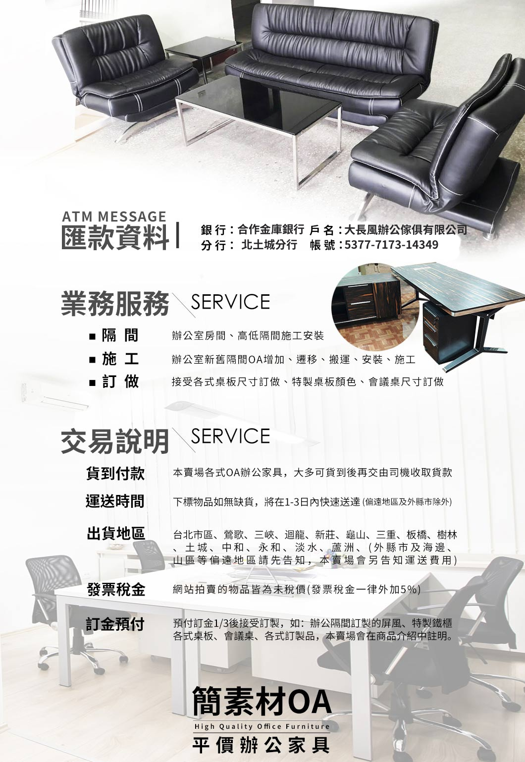 專營辦公家具、OA屏風、會議桌、高隔間等二手辦公設備,在土城中古家具業中的風評有口皆碑,只要是跟開公司有關的二手辦公家具我們都有,例如:二手oa隔板、二手oa辦公桌、二手主管桌、二手工作桌、…甚至是二手鐵櫃、二手沙發等也有提供。